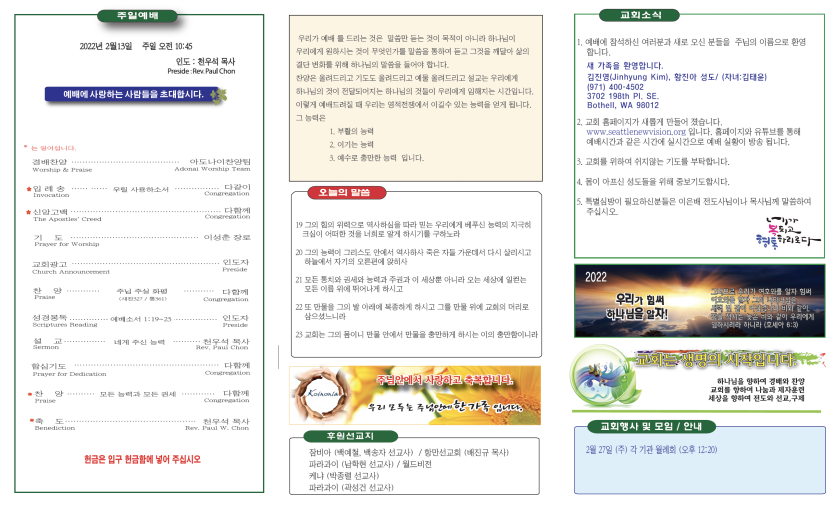 2022년 2월13일 주보 페이지 정보 작성자 뉴비전교회 조회 584회 작성일 22-02-13 10:50 목록 본문 2022년 2월13일 주보 이전글2월20일 주일주보 22.02.20 다음글제1권24호 21.12.26