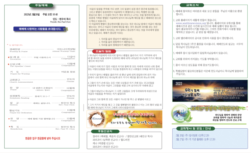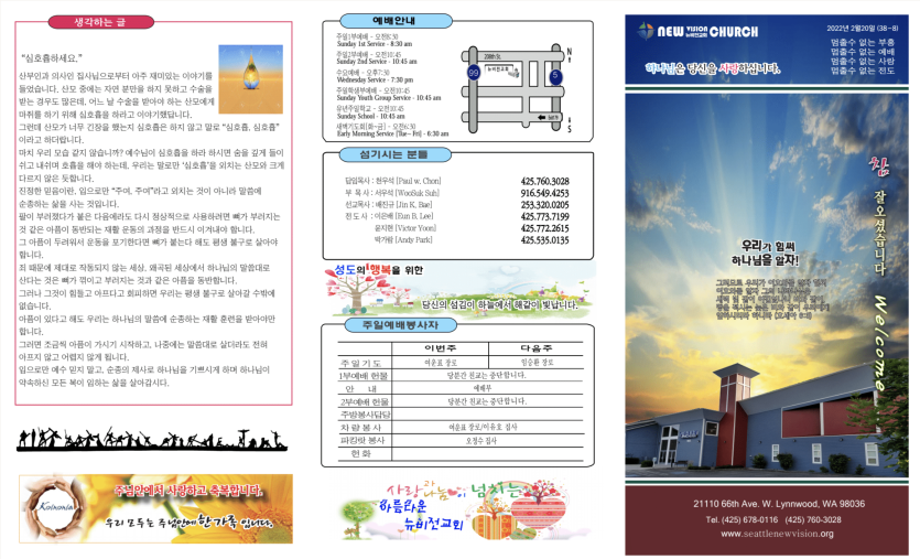 2월20일 주일주보 페이지 정보 작성자 뉴비전교회 조회 498회 작성일 22-02-20 11:26 목록 본문 2월20일 주일주보 이전글2022년2월27일 주보안내 22.02.27 다음글2022년 2월13일 주보 22.02.13
