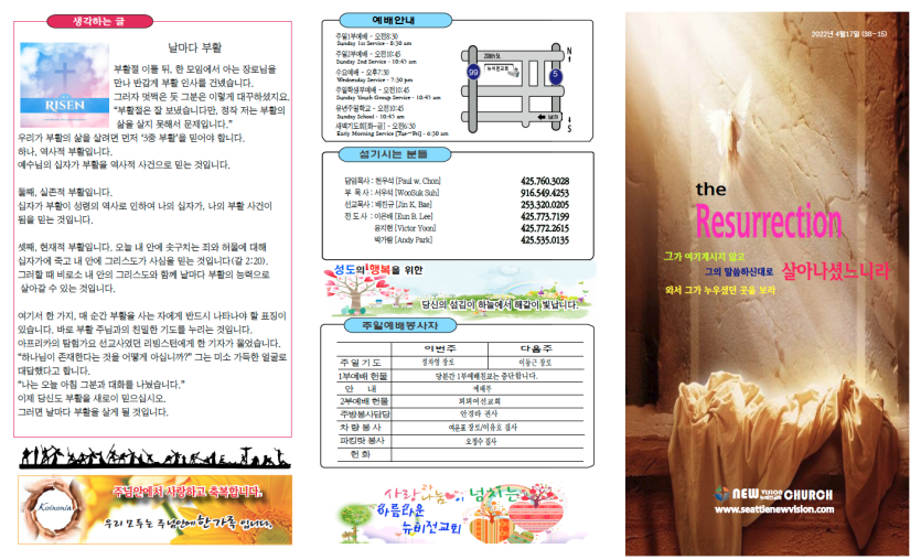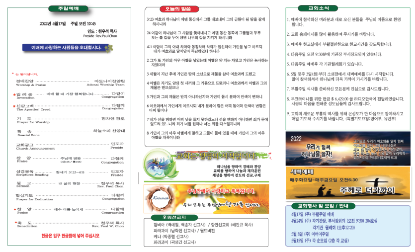 2022년4월17일 주보안내 페이지 정보 작성자 뉴비전교회 조회 490회 작성일 22-04-17 07:51 목록 본문 2022년4월17일 주보안내 이전글2022년4월24일 주보안내 22.04.24 다음글2022년4월10일 주보안내 22.04.10