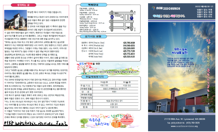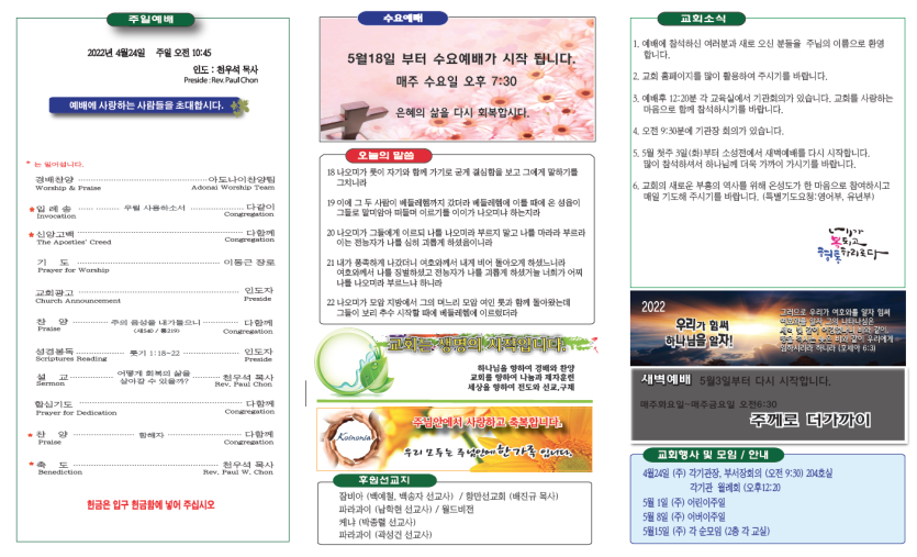 2022년4월24일 주보안내 페이지 정보 작성자 뉴비전교회 조회 540회 작성일 22-04-24 06:14 목록 본문 2022년4월24일 주보안내 이전글2022년5월1일 주보안내 22.05.01 다음글2022년4월17일 주보안내 22.04.17