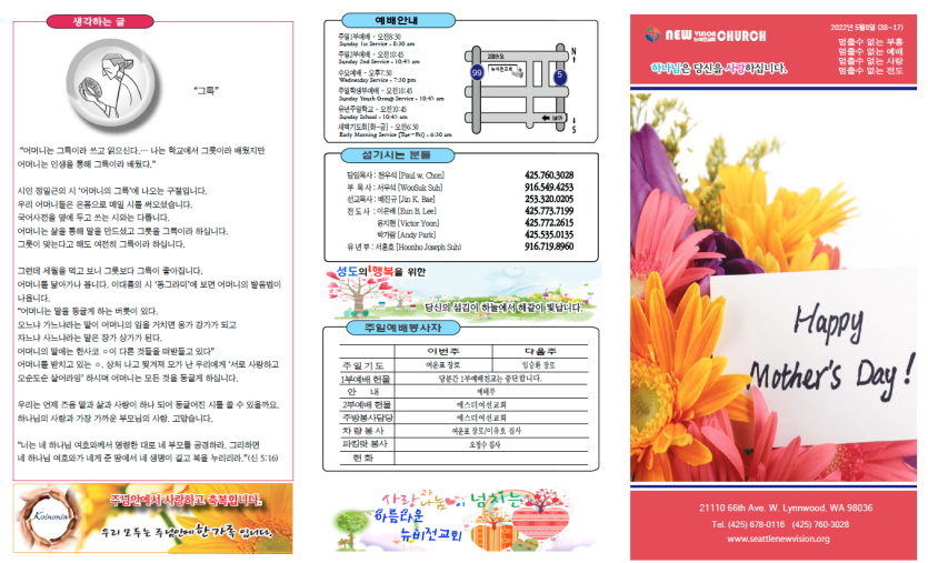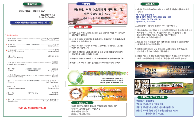 2022년 5월8일 주일주보 페이지 정보 작성자 뉴비전교회 조회 503회 작성일 22-05-08 07:55 목록 본문 2022년 5월8일 주일주보 이전글2022년5월15일 주보안내 22.06.01 다음글2022년5월1일 주보안내 22.05.01