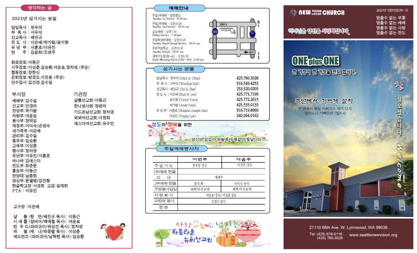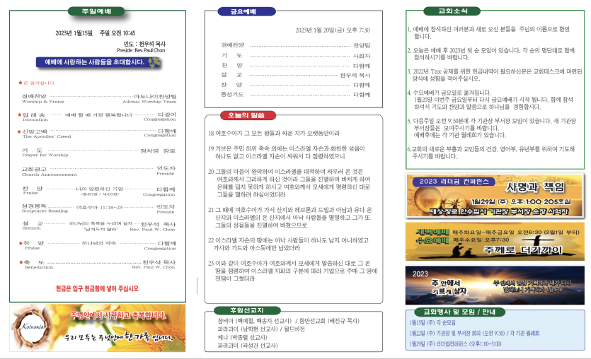 2023년1월15일 주보안내 페이지 정보 작성자 뉴비전교회 조회 433회 작성일 23-01-30 08:19 목록 본문 2023년1월15일 주보안내 이전글2023년1월22일 주보안내 23.01.30 다음글2023년1월8일 주보안내 23.01.15