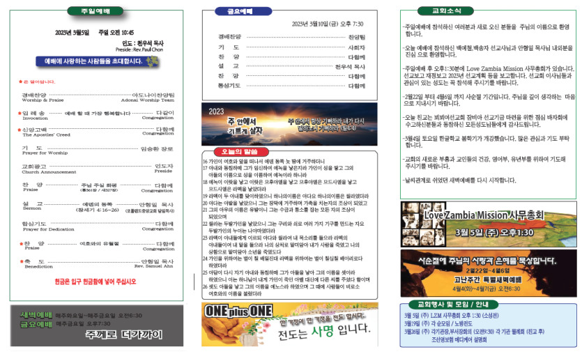 2023년3월5일 주보안내 페이지 정보 작성자 뉴비전교회 조회 432회 작성일 23-03-19 07:44 목록 본문 2023년3월5일 주보안내 이전글2023년3월12일 주보안내 23.03.19 다음글2023년2월26일 주보안내 23.03.19