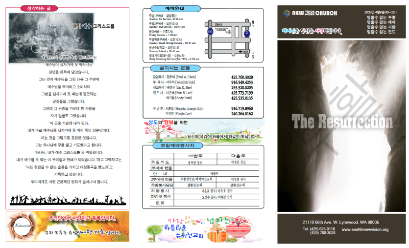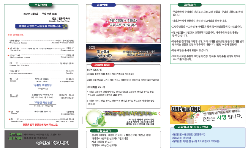 2023년4월9일 주보안내 페이지 정보 작성자 뉴비전교회 조회 360회 작성일 23-04-09 05:09 목록 본문 2023년4월9일 주보안내 이전글2023년4월16일 주보안내 23.04.23 다음글2023년4월2일 주보안내 23.04.02