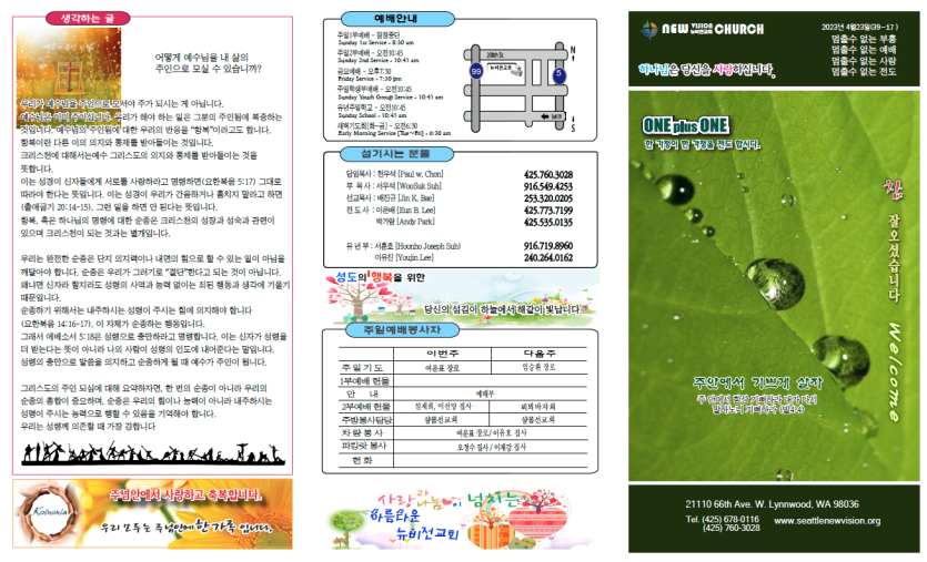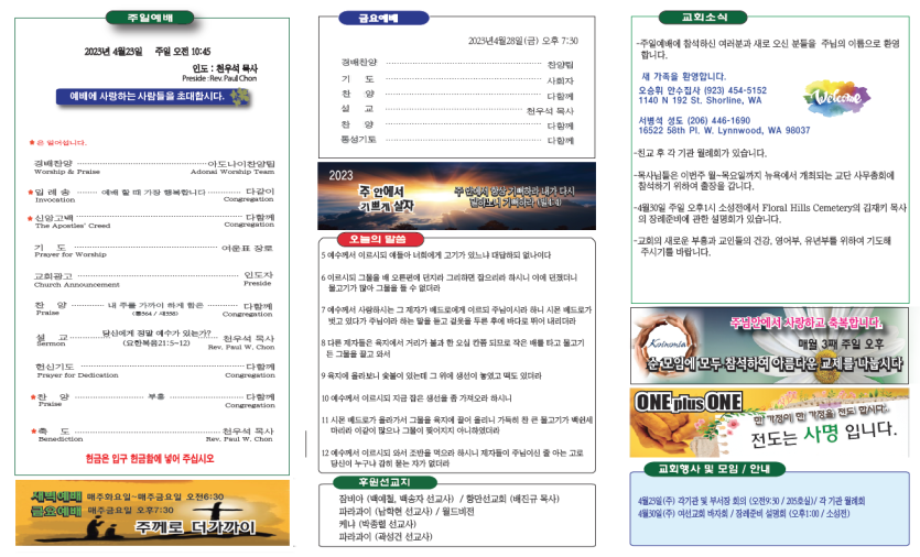 2023년4월23일 주보안내 페이지 정보 작성자 뉴비전교회 조회 354회 작성일 23-04-23 07:08 목록 본문 2023년4월23일 주보안내 이전글2023년4월30일 주보안내 23.04.30 다음글2023년4월16일 주보안내 23.04.23